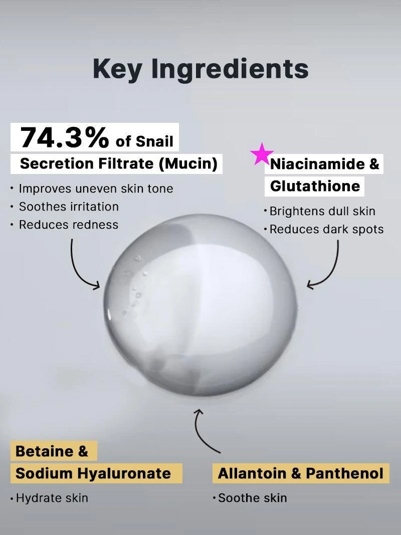 يحتوي على مستخلص الحلزون، النياسيناميد، البيبتيدات، الجلوتاثيون، ومستخلصات نباتية مغذية |