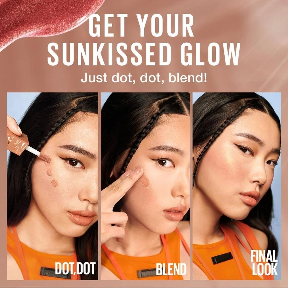 بلشر أحمر خدود وبرونزر سائل سنكيسر من ميبيلين لمكياج لا مثيل له اكتشفي أحمر الخدود والبرونزر السائل المتوهج والقابل للدمج مع تركيبة خفيفة الوزن غنية بفيتامين E. لونه قابل للبناء وألوان تذوب على الجلد. يوفر لونًا صحيًا للخد، ويمكن وضعه بسهولة باست