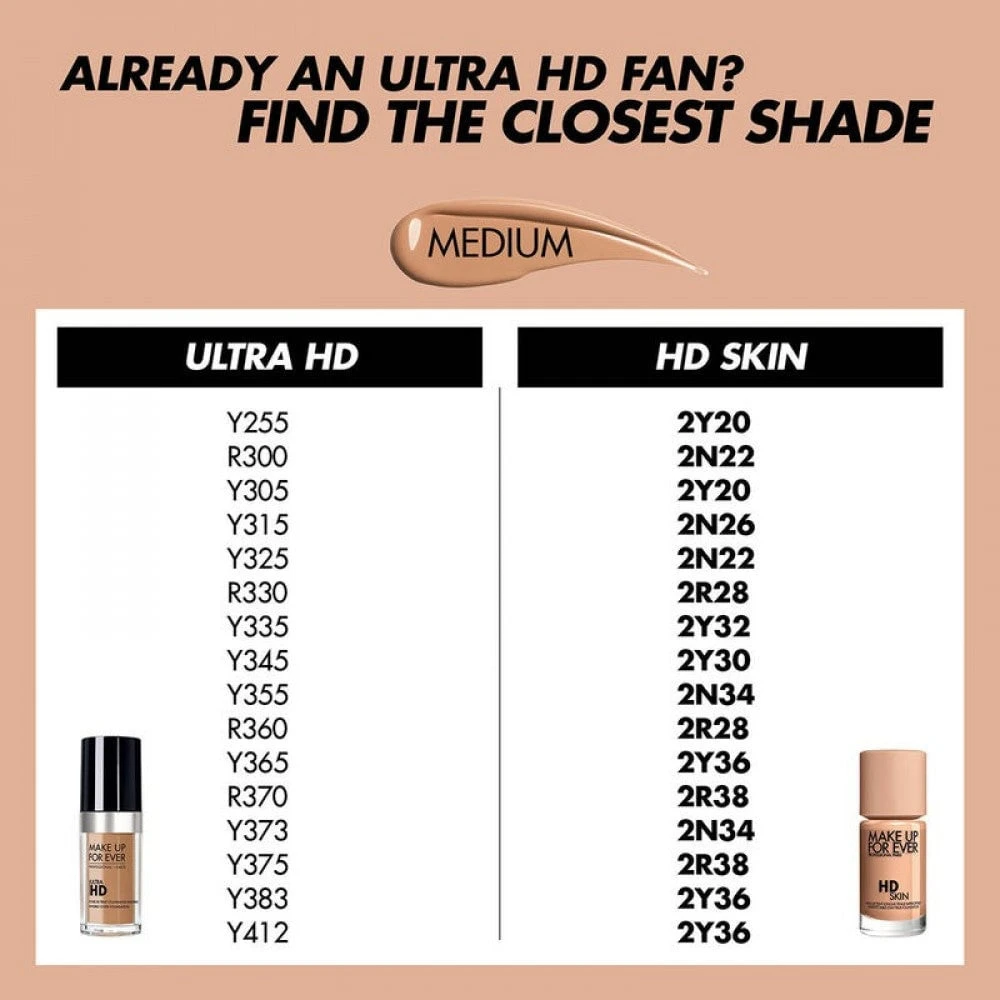 ميك اب فور ايفر تقدم مجموعتها الكبيرة جدا من ألوان الفاونديشن الترا اتش دي و البالغة 50 لون ، و هو كريم أساس سائل يمنح وجهك تغطية متوسطة و مظهر طبيعي في النهاية ، لطيف على البشرة فهو معزز بكرات هيالورنيك الصوديوم المرطب و السليكيا و السيرسيت و ستمنحك هذه